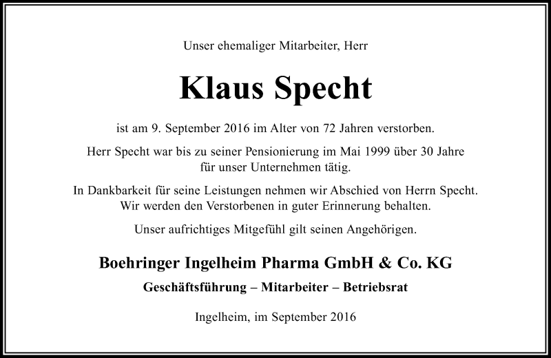 Hier finden Sie alle Traueranzeigen aus der Zeitung, die bisher für Klaus Specht erschienen sind. Weitere Traueranzeigen, die in der Zeitung erscheinen, werden hier ebenfalls aufgelistet