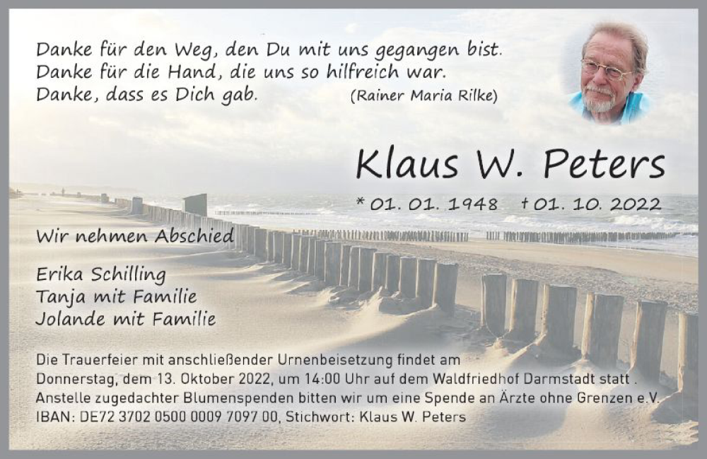 Hier finden Sie alle Traueranzeigen aus der Zeitung, die bisher für Klaus W. Peters erschienen sind. Weitere Traueranzeigen, die in der Zeitung erscheinen, werden hier ebenfalls aufgelistet