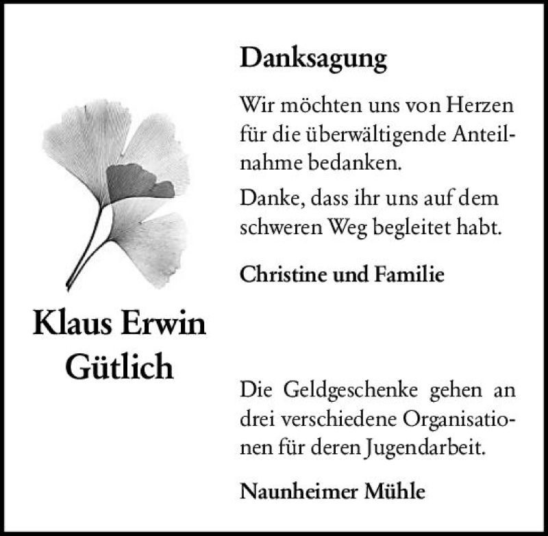 Hier finden Sie alle Traueranzeigen aus der Zeitung, die bisher für Klaus Erwin Gütlich erschienen sind. Weitere Traueranzeigen, die in der Zeitung erscheinen, werden hier ebenfalls aufgelistet