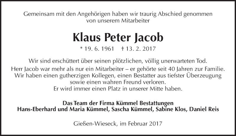 Hier finden Sie alle Traueranzeigen aus der Zeitung, die bisher für Klaus Peter Jacob erschienen sind. Weitere Traueranzeigen, die in der Zeitung erscheinen, werden hier ebenfalls aufgelistet