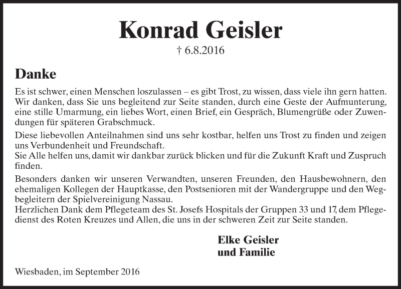Hier finden Sie alle Traueranzeigen aus der Zeitung, die bisher für Konrad Geisler erschienen sind. Weitere Traueranzeigen, die in der Zeitung erscheinen, werden hier ebenfalls aufgelistet