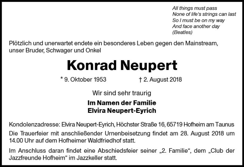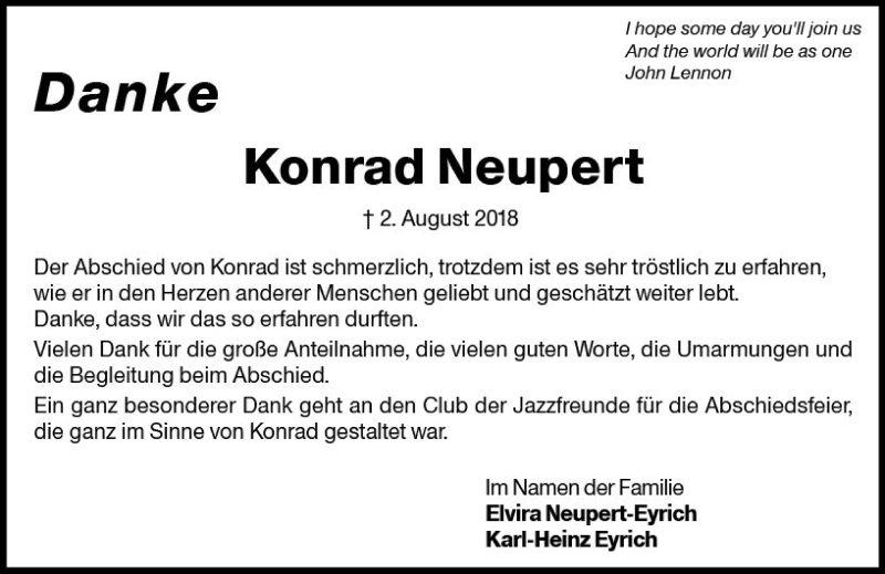 Hier finden Sie alle Traueranzeigen aus der Zeitung, die bisher für Konrad Neupert erschienen sind. Weitere Traueranzeigen, die in der Zeitung erscheinen, werden hier ebenfalls aufgelistet