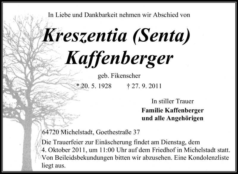 Hier finden Sie alle Traueranzeigen aus der Zeitung, die bisher für Kreszentia (Senta) Kaffenberger erschienen sind. Weitere Traueranzeigen, die in der Zeitung erscheinen, werden hier ebenfalls aufgelistet