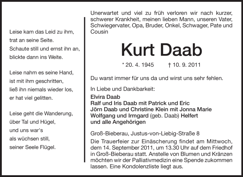 Hier finden Sie alle Traueranzeigen aus der Zeitung, die bisher für Kurt Daab erschienen sind. Weitere Traueranzeigen, die in der Zeitung erscheinen, werden hier ebenfalls aufgelistet