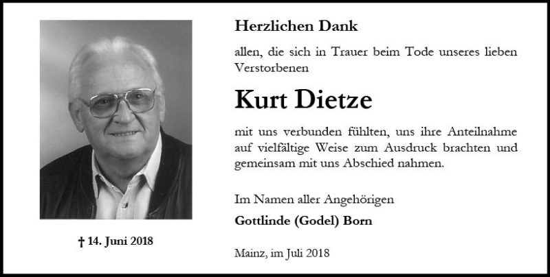 Hier finden Sie alle Traueranzeigen aus der Zeitung, die bisher für Kurt Dietze erschienen sind. Weitere Traueranzeigen, die in der Zeitung erscheinen, werden hier ebenfalls aufgelistet