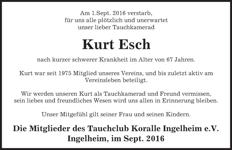 Hier finden Sie alle Traueranzeigen aus der Zeitung, die bisher für Kurt Esch erschienen sind. Weitere Traueranzeigen, die in der Zeitung erscheinen, werden hier ebenfalls aufgelistet