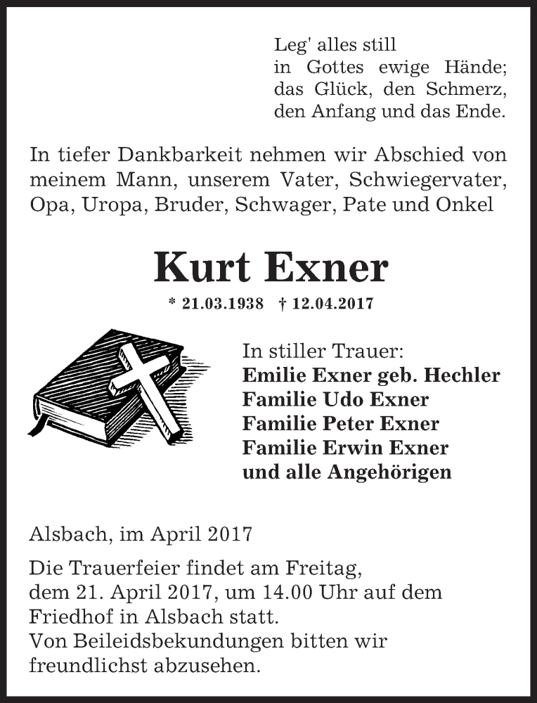 Hier finden Sie alle Traueranzeigen aus der Zeitung, die bisher für Kurt Exner erschienen sind. Weitere Traueranzeigen, die in der Zeitung erscheinen, werden hier ebenfalls aufgelistet