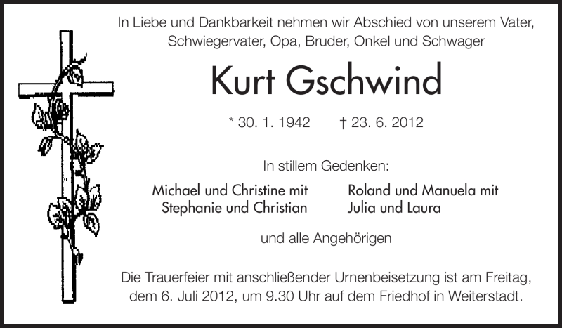 Hier finden Sie alle Traueranzeigen aus der Zeitung, die bisher für Kurt Gschwind erschienen sind. Weitere Traueranzeigen, die in der Zeitung erscheinen, werden hier ebenfalls aufgelistet
