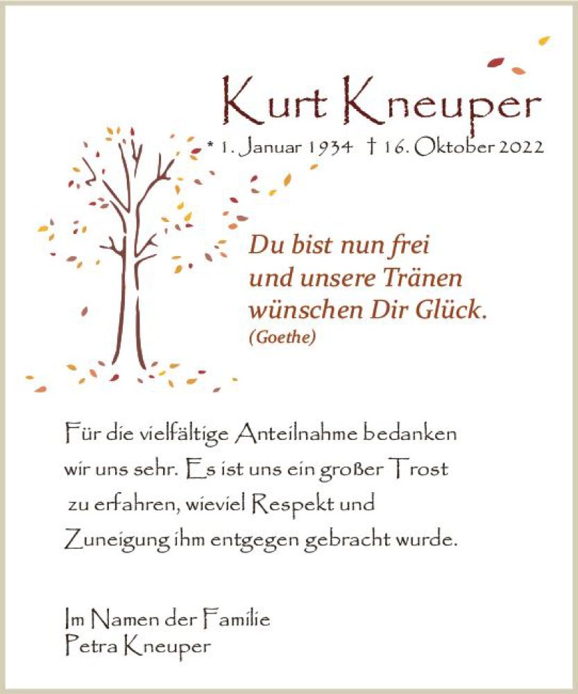 Hier finden Sie alle Traueranzeigen aus der Zeitung, die bisher für Kurt Kneuper erschienen sind. Weitere Traueranzeigen, die in der Zeitung erscheinen, werden hier ebenfalls aufgelistet