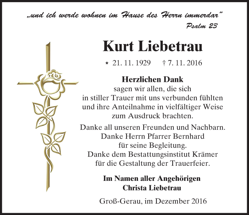 Hier finden Sie alle Traueranzeigen aus der Zeitung, die bisher für Kurt Liebetrau erschienen sind. Weitere Traueranzeigen, die in der Zeitung erscheinen, werden hier ebenfalls aufgelistet