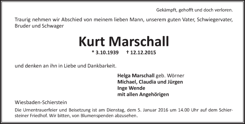 Hier finden Sie alle Traueranzeigen aus der Zeitung, die bisher für Kurt Marschall erschienen sind. Weitere Traueranzeigen, die in der Zeitung erscheinen, werden hier ebenfalls aufgelistet