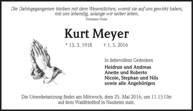 Hier finden Sie alle Traueranzeigen aus der Zeitung, die bisher für Kurt Meyer erschienen sind. Weitere Traueranzeigen, die in der Zeitung erscheinen, werden hier ebenfalls aufgelistet