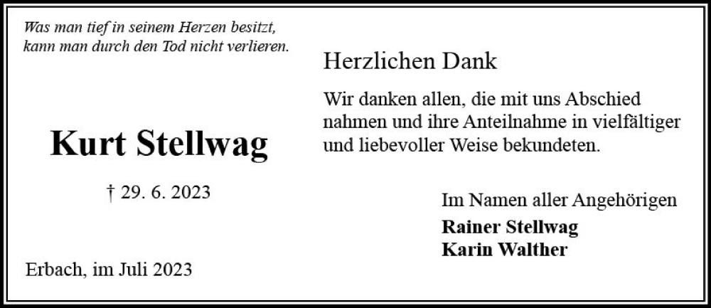 Hier finden Sie alle Traueranzeigen aus der Zeitung, die bisher für Kurt Stellwag erschienen sind. Weitere Traueranzeigen, die in der Zeitung erscheinen, werden hier ebenfalls aufgelistet