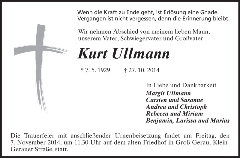 Hier finden Sie alle Traueranzeigen aus der Zeitung, die bisher für Kurt Ullmann erschienen sind. Weitere Traueranzeigen, die in der Zeitung erscheinen, werden hier ebenfalls aufgelistet