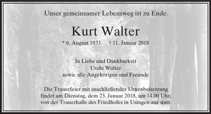 Hier finden Sie alle Traueranzeigen aus der Zeitung, die bisher für Kurt Walter erschienen sind. Weitere Traueranzeigen, die in der Zeitung erscheinen, werden hier ebenfalls aufgelistet