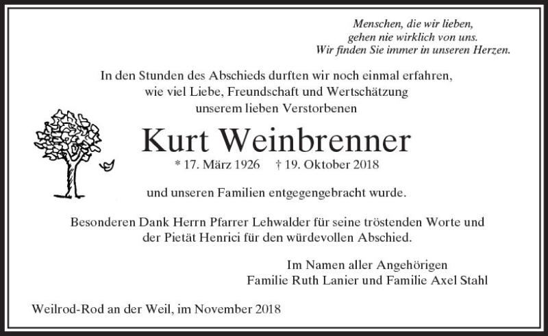 Hier finden Sie alle Traueranzeigen aus der Zeitung, die bisher für Kurt Weinbrenner erschienen sind. Weitere Traueranzeigen, die in der Zeitung erscheinen, werden hier ebenfalls aufgelistet
