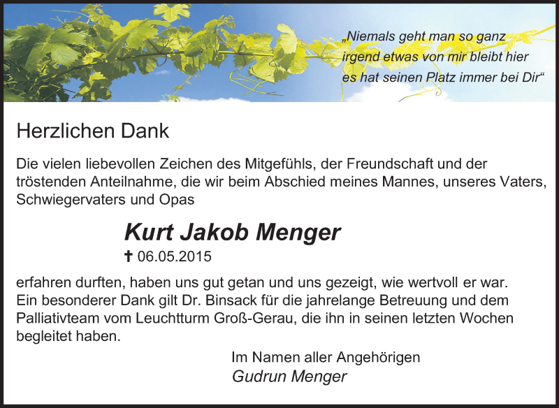 Hier finden Sie alle Traueranzeigen aus der Zeitung, die bisher für Kurt Jakob Menger erschienen sind. Weitere Traueranzeigen, die in der Zeitung erscheinen, werden hier ebenfalls aufgelistet