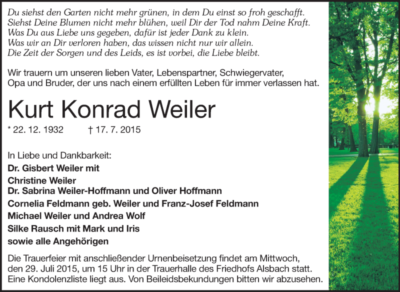 Hier finden Sie alle Traueranzeigen aus der Zeitung, die bisher für Kurt Konrad Weiler erschienen sind. Weitere Traueranzeigen, die in der Zeitung erscheinen, werden hier ebenfalls aufgelistet