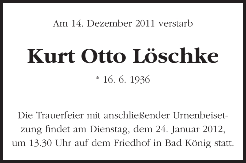 Hier finden Sie alle Traueranzeigen aus der Zeitung, die bisher für Kurt Otto Löschke erschienen sind. Weitere Traueranzeigen, die in der Zeitung erscheinen, werden hier ebenfalls aufgelistet