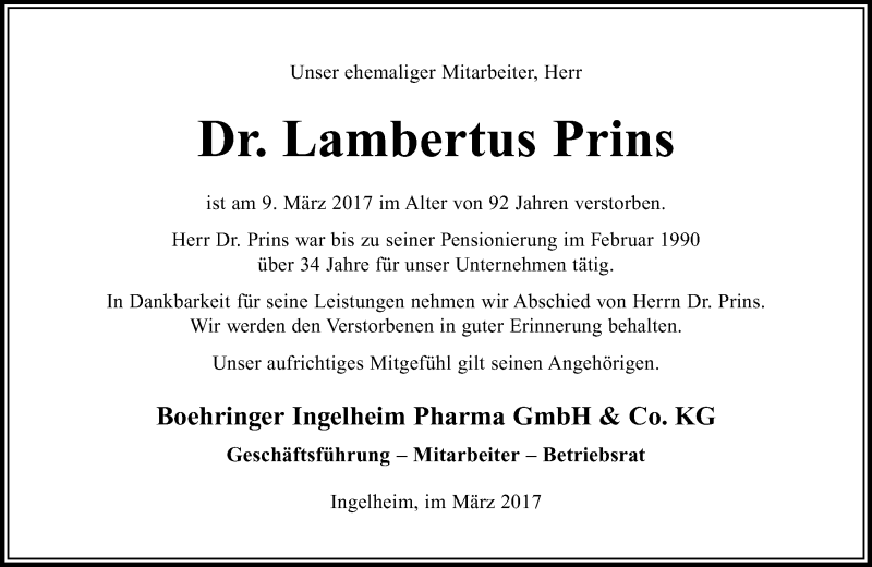 Hier finden Sie alle Traueranzeigen aus der Zeitung, die bisher für Lambertus Prins erschienen sind. Weitere Traueranzeigen, die in der Zeitung erscheinen, werden hier ebenfalls aufgelistet