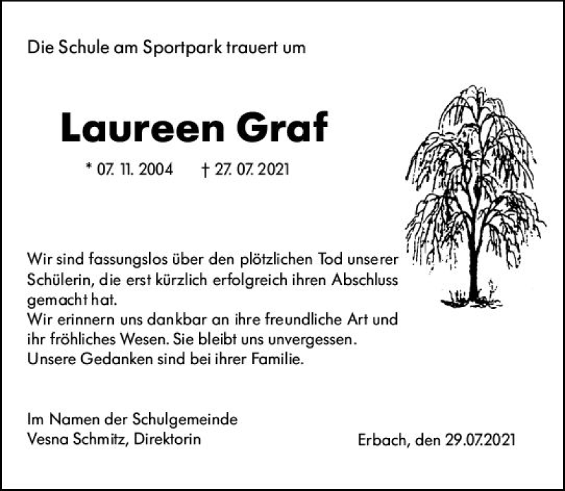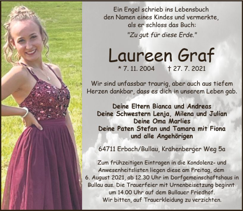 Hier finden Sie alle Traueranzeigen aus der Zeitung, die bisher für Laureen Graf erschienen sind. Weitere Traueranzeigen, die in der Zeitung erscheinen, werden hier ebenfalls aufgelistet