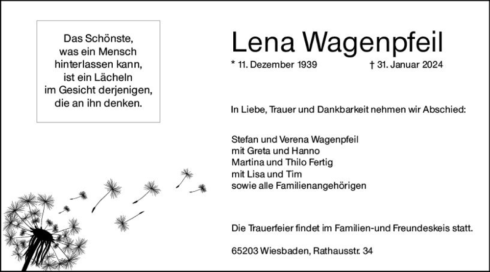 Hier finden Sie alle Traueranzeigen aus der Zeitung, die bisher für Lena Wagenpfeil erschienen sind. Weitere Traueranzeigen, die in der Zeitung erscheinen, werden hier ebenfalls aufgelistet
