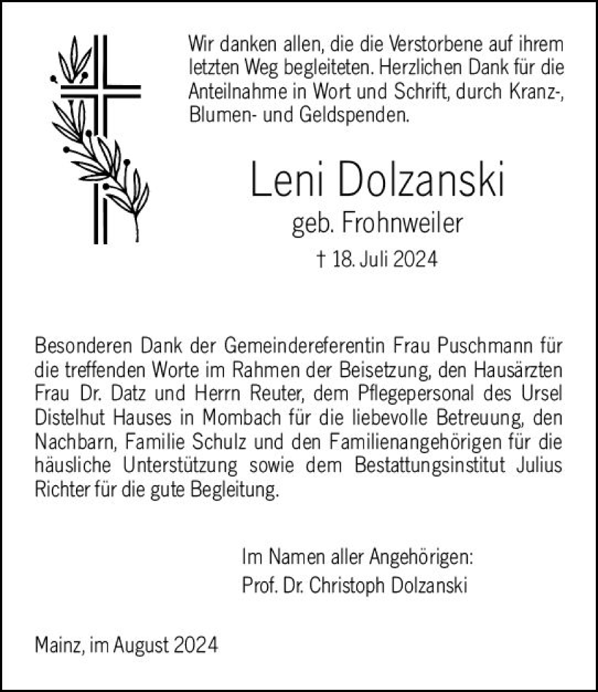 Hier finden Sie alle Traueranzeigen aus der Zeitung, die bisher für Leni Dolzanski erschienen sind. Weitere Traueranzeigen, die in der Zeitung erscheinen, werden hier ebenfalls aufgelistet