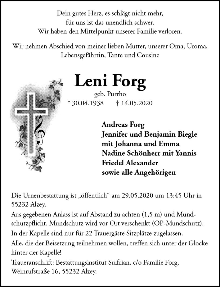 Hier finden Sie alle Traueranzeigen aus der Zeitung, die bisher für Leni Forg erschienen sind. Weitere Traueranzeigen, die in der Zeitung erscheinen, werden hier ebenfalls aufgelistet