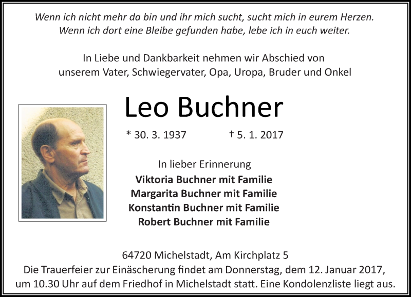 Hier finden Sie alle Traueranzeigen aus der Zeitung, die bisher für Leo Buchner erschienen sind. Weitere Traueranzeigen, die in der Zeitung erscheinen, werden hier ebenfalls aufgelistet