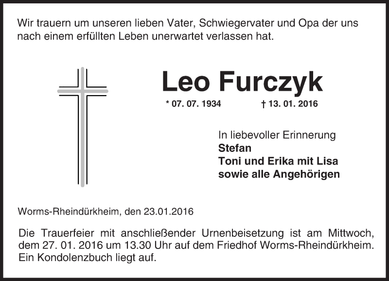 Hier finden Sie alle Traueranzeigen aus der Zeitung, die bisher für Leo Furczyk erschienen sind. Weitere Traueranzeigen, die in der Zeitung erscheinen, werden hier ebenfalls aufgelistet