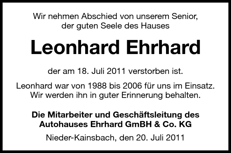 Hier finden Sie alle Traueranzeigen aus der Zeitung, die bisher für Leonhard Ehrhard erschienen sind. Weitere Traueranzeigen, die in der Zeitung erscheinen, werden hier ebenfalls aufgelistet