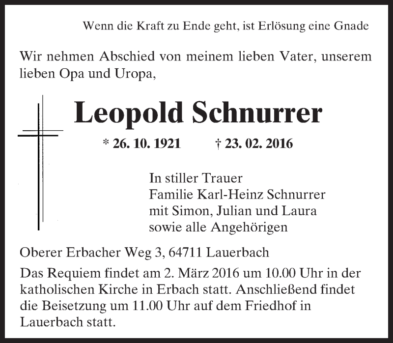 Hier finden Sie alle Traueranzeigen aus der Zeitung, die bisher für Leopold Schnurrer erschienen sind. Weitere Traueranzeigen, die in der Zeitung erscheinen, werden hier ebenfalls aufgelistet