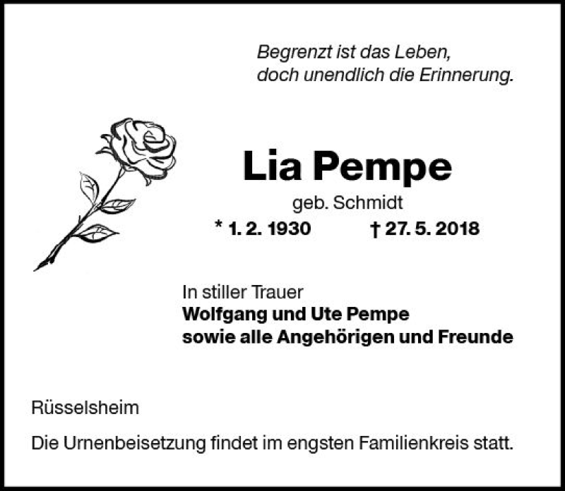 Hier finden Sie alle Traueranzeigen aus der Zeitung, die bisher für Lia Pempe erschienen sind. Weitere Traueranzeigen, die in der Zeitung erscheinen, werden hier ebenfalls aufgelistet