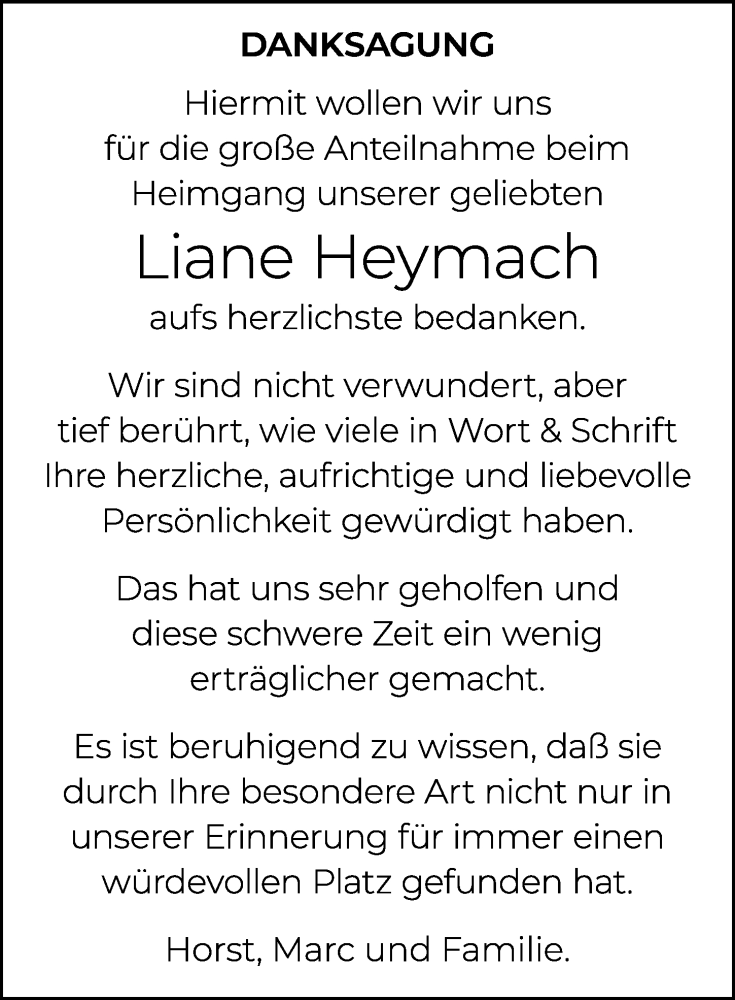 Hier finden Sie alle Traueranzeigen aus der Zeitung, die bisher für Liane Heymach erschienen sind. Weitere Traueranzeigen, die in der Zeitung erscheinen, werden hier ebenfalls aufgelistet