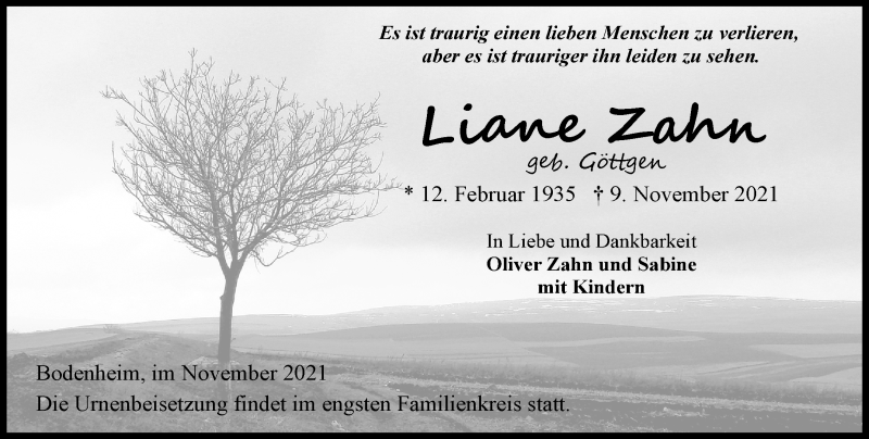 Hier finden Sie alle Traueranzeigen aus der Zeitung, die bisher für Liane Zahn erschienen sind. Weitere Traueranzeigen, die in der Zeitung erscheinen, werden hier ebenfalls aufgelistet
