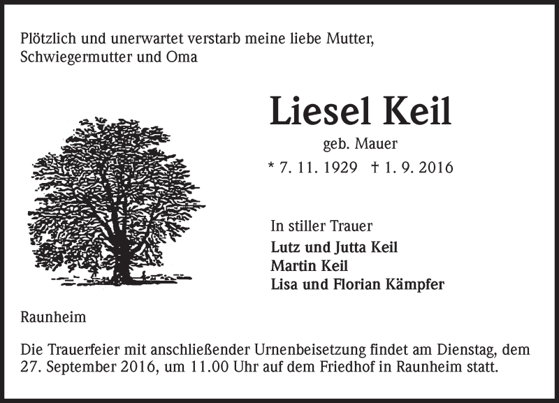 Hier finden Sie alle Traueranzeigen aus der Zeitung, die bisher für Liesel Keil erschienen sind. Weitere Traueranzeigen, die in der Zeitung erscheinen, werden hier ebenfalls aufgelistet
