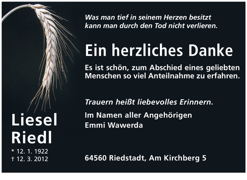 Hier finden Sie alle Traueranzeigen aus der Zeitung, die bisher für Liesel Riedl erschienen sind. Weitere Traueranzeigen, die in der Zeitung erscheinen, werden hier ebenfalls aufgelistet