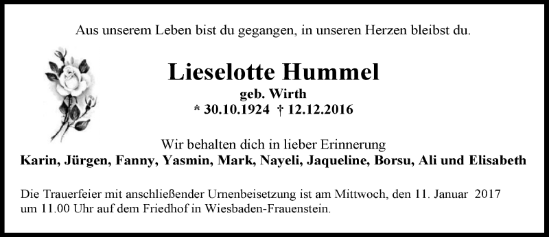 Hier finden Sie alle Traueranzeigen aus der Zeitung, die bisher für Lieselotte Hummel erschienen sind. Weitere Traueranzeigen, die in der Zeitung erscheinen, werden hier ebenfalls aufgelistet