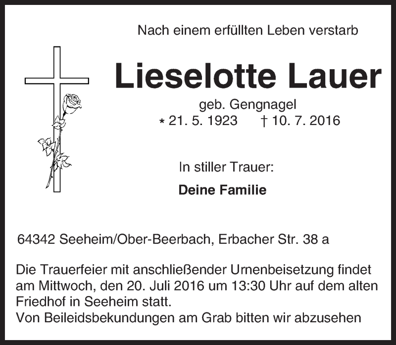 Hier finden Sie alle Traueranzeigen aus der Zeitung, die bisher für Lieselotte Lauer erschienen sind. Weitere Traueranzeigen, die in der Zeitung erscheinen, werden hier ebenfalls aufgelistet