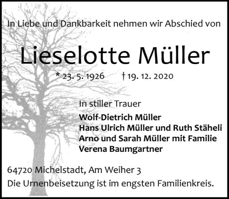 Hier finden Sie alle Traueranzeigen aus der Zeitung, die bisher für Lieselotte Müller erschienen sind. Weitere Traueranzeigen, die in der Zeitung erscheinen, werden hier ebenfalls aufgelistet
