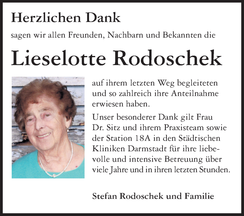 Hier finden Sie alle Traueranzeigen aus der Zeitung, die bisher für Lieselotte Rodoschek erschienen sind. Weitere Traueranzeigen, die in der Zeitung erscheinen, werden hier ebenfalls aufgelistet