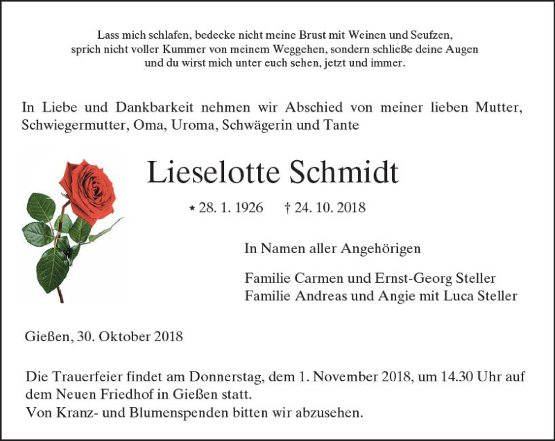 Hier finden Sie alle Traueranzeigen aus der Zeitung, die bisher für Lieselotte Schmidt erschienen sind. Weitere Traueranzeigen, die in der Zeitung erscheinen, werden hier ebenfalls aufgelistet