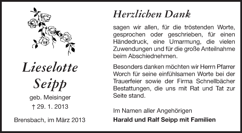 Hier finden Sie alle Traueranzeigen aus der Zeitung, die bisher für Lieselotte Seipp erschienen sind. Weitere Traueranzeigen, die in der Zeitung erscheinen, werden hier ebenfalls aufgelistet