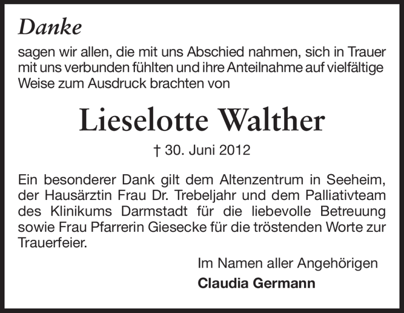 Hier finden Sie alle Traueranzeigen aus der Zeitung, die bisher für Lieselotte Walther erschienen sind. Weitere Traueranzeigen, die in der Zeitung erscheinen, werden hier ebenfalls aufgelistet