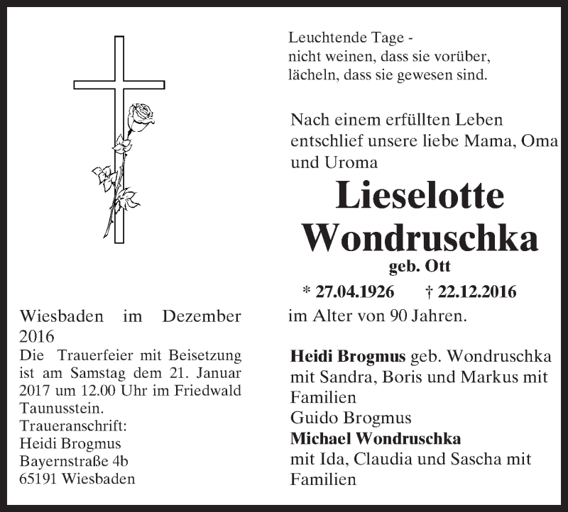 Hier finden Sie alle Traueranzeigen aus der Zeitung, die bisher für Lieselotte Wondruschka erschienen sind. Weitere Traueranzeigen, die in der Zeitung erscheinen, werden hier ebenfalls aufgelistet