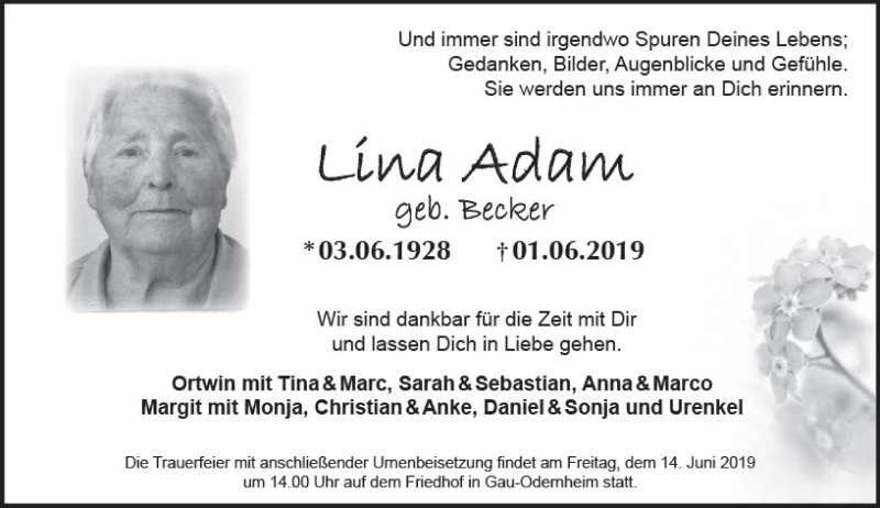 Hier finden Sie alle Traueranzeigen aus der Zeitung, die bisher für Lina Adam erschienen sind. Weitere Traueranzeigen, die in der Zeitung erscheinen, werden hier ebenfalls aufgelistet
