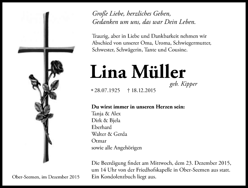Hier finden Sie alle Traueranzeigen aus der Zeitung, die bisher für Lina Müller erschienen sind. Weitere Traueranzeigen, die in der Zeitung erscheinen, werden hier ebenfalls aufgelistet