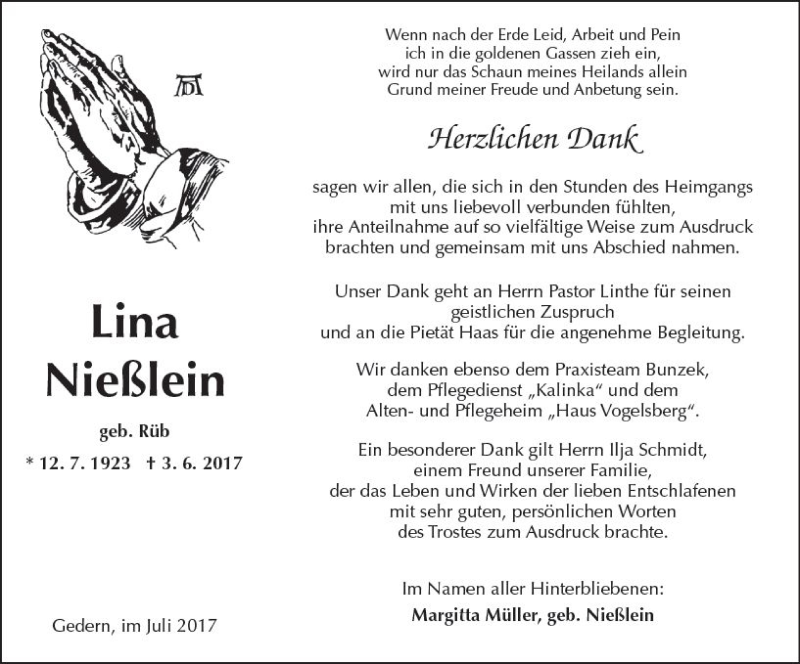 Hier finden Sie alle Traueranzeigen aus der Zeitung, die bisher für Lina Nießlein erschienen sind. Weitere Traueranzeigen, die in der Zeitung erscheinen, werden hier ebenfalls aufgelistet