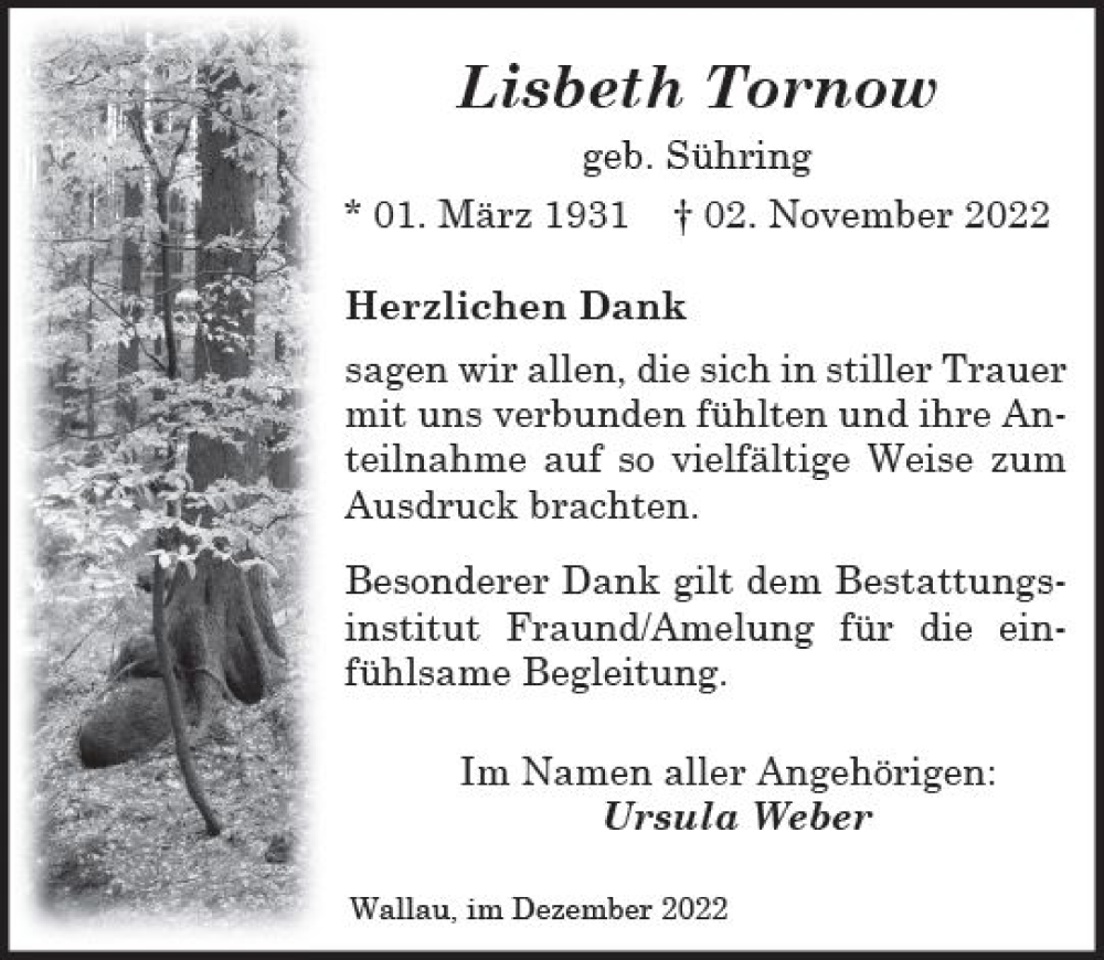 Hier finden Sie alle Traueranzeigen aus der Zeitung, die bisher für Lisbeth Tornow erschienen sind. Weitere Traueranzeigen, die in der Zeitung erscheinen, werden hier ebenfalls aufgelistet