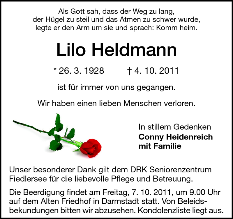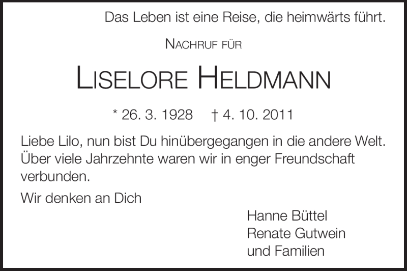 Hier finden Sie alle Traueranzeigen aus der Zeitung, die bisher für Liselore Heldmann erschienen sind. Weitere Traueranzeigen, die in der Zeitung erscheinen, werden hier ebenfalls aufgelistet